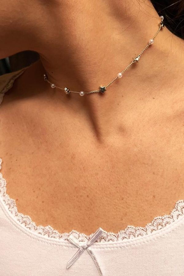 Halskette mit Sternen und Perlen, Karabinerhaken-Verschluss, mit verstellbarer Länge.
