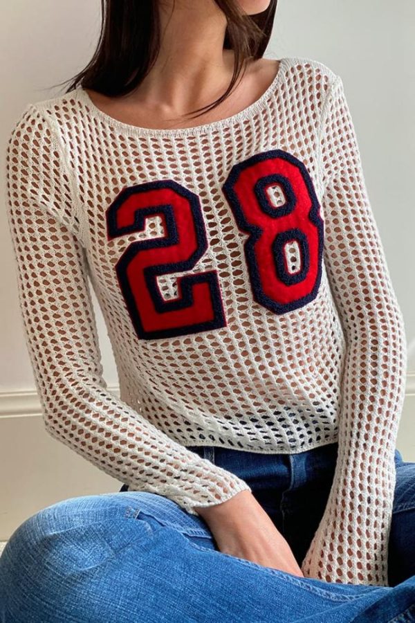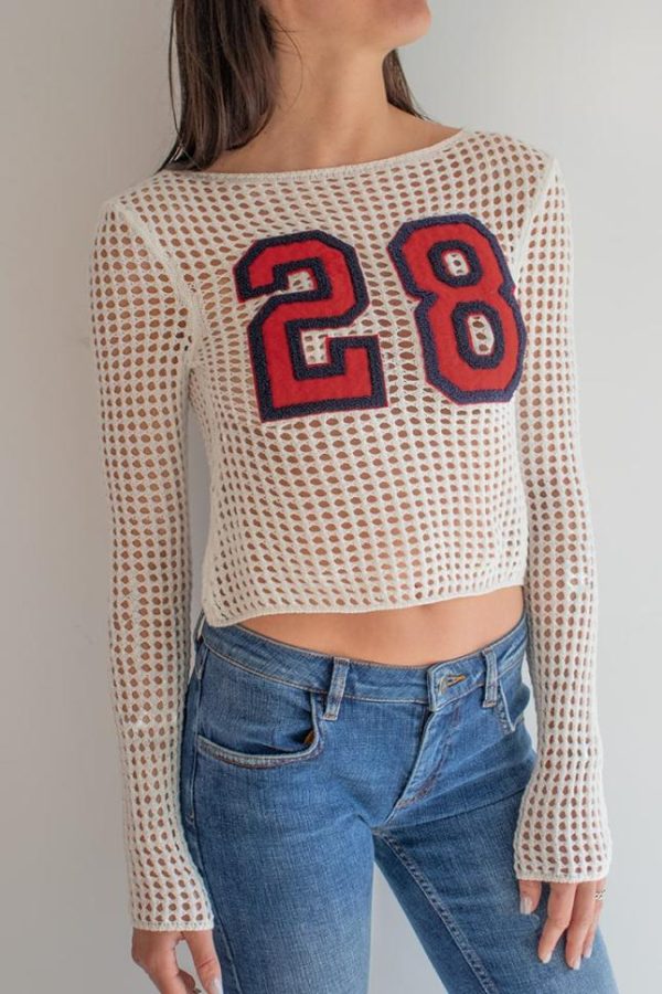 Patch openwork jumper crew neckline, long sleeves, short length, slim fit.