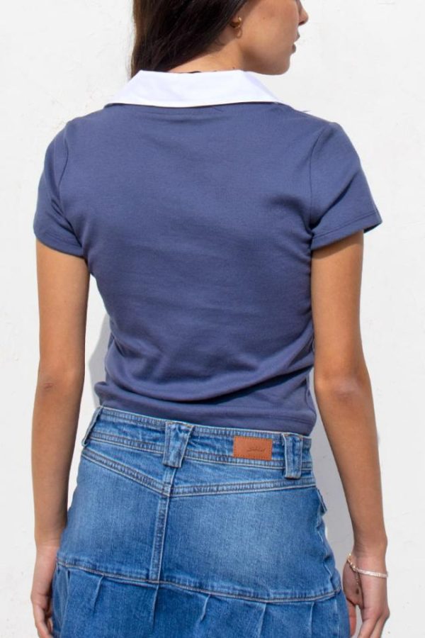 T-Shirt mit Kragen, V-Ausschnitt, kurze Ärmel, kurze Länge, enge Passform.