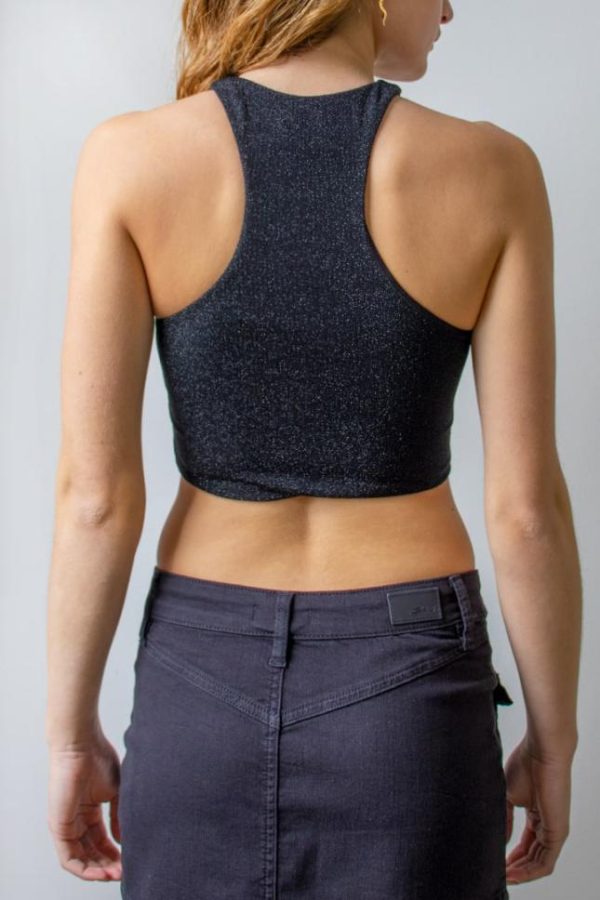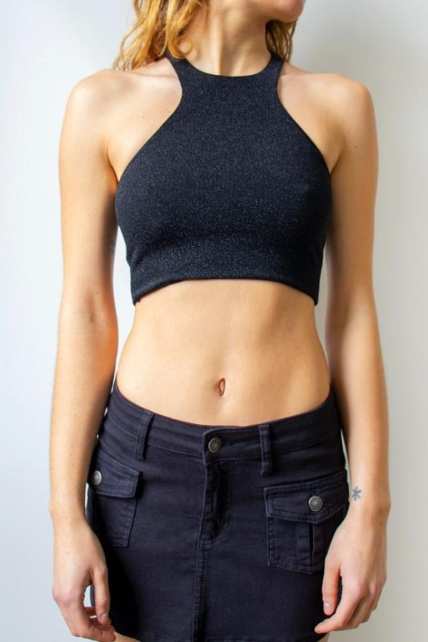 Top mit amerikanischem Ausschnitt, Rundhalsausschnitt, ärmellos, kurze Länge, schmale Passform.
