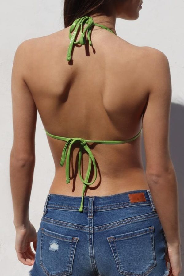 Bikini Top mit dreieckigen Cups, herausnehmbare Polsterung, gefütterter Innenraum, Trägern, Verschluss am Rücken.